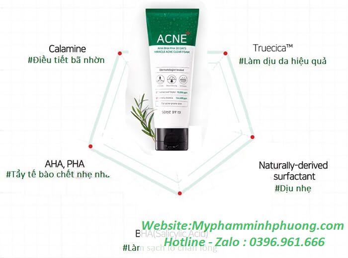 - Sữa rửa mặt Some By Mi AHA-BHA-PHA 30 Days Miracle Acne chứa chất hoạt động bề mặt có nguồn gốc từ dừa, chiết xuất từ thiên nhiên giảm tối thiểu khả năng kích ứng da trong quá trình làm sạch, do đó cực kỳ dịu nhẹ cho da