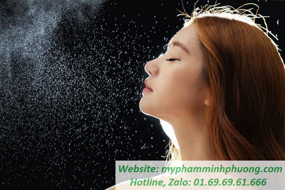 Vẫn bằng phương pháp cũ, sau khi thực hiện đầy đủ các bước chăm sóc da cơ bản mình tiến hành sử dụng xịt khoáng trên da mặt